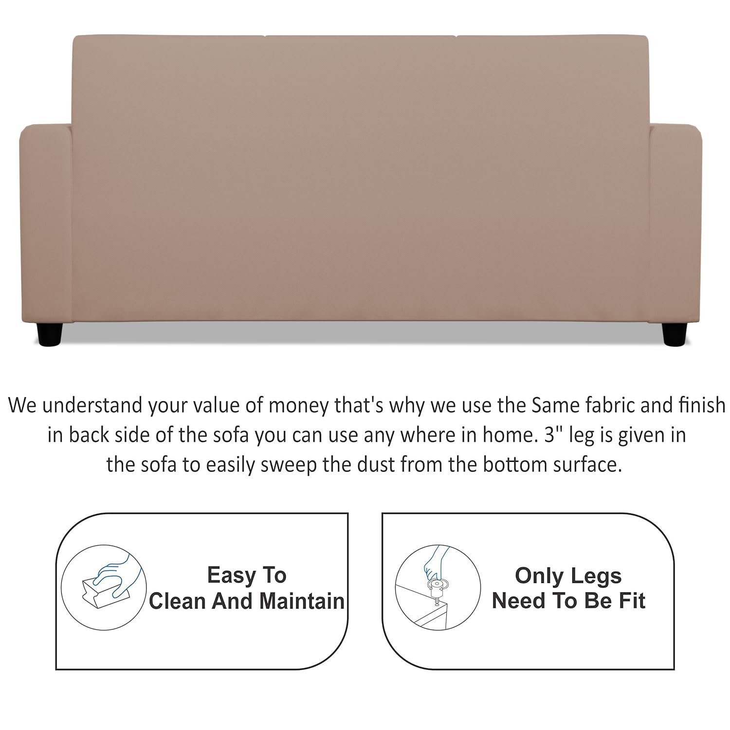 Cleaning under the sofa has always been a cumbersome task. However, this sofa set stands on Heavy duty Engineering fiber legs with 3-inch thickness that easily support your weight and also provide space for sweeping dust and dirt from under the sofa. As a precautionary measure, make sure that you use a dry cloth to wipe this sofa set instead of water or any other cleaning liquid.