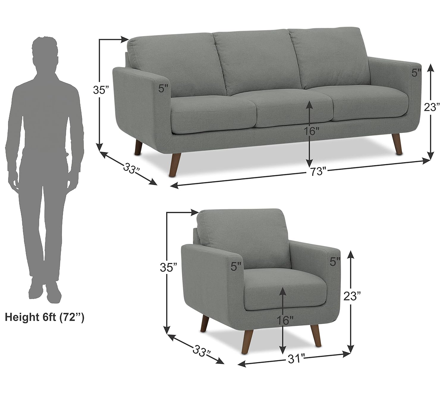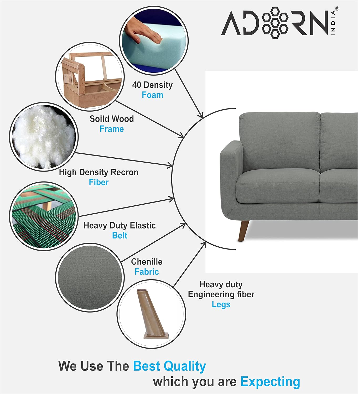 Product Material: Sal wood & Pine wood, Foam Material : seat 40 density foam , back cushion high density recron fiber etc. / Heavy duty Zigzag Spring – Upholstery material : chenille (Polyester) – Leg Material – Heavy duty industrial fiber legs – Product color : Grey