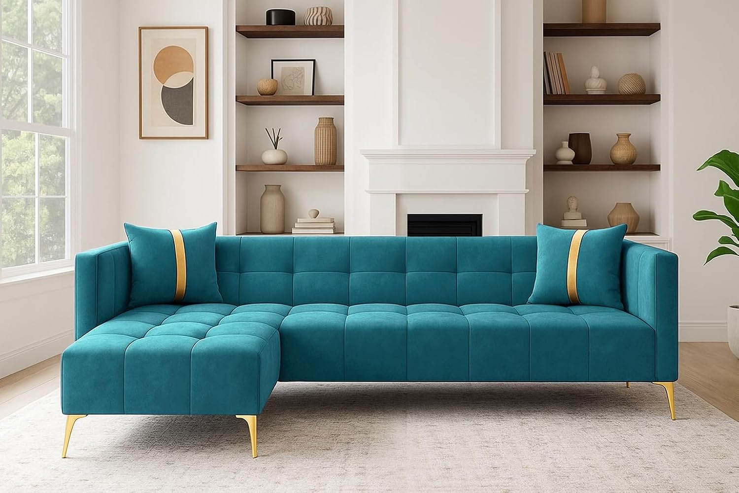 DESIGN: 6 Seater L Shape Sofa set featuring modern styling, tufted back, and Tall Arms, perfect for contemporary living rooms