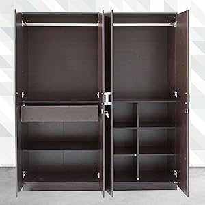 Construction:- The wardrobe has hinged doors The hanger pole is installed at an ergonomic height for easy accessibility of hangers The oval shape allows the hangers to twist on the pole easily . Oval poles are also stronger due to their weight bearing capacity. The drawer is mounted on telescopic channels. These channels provide full accessibility to the storage space. All doors are fitted with locks that come with metal keys. , [ad_2] , , ,