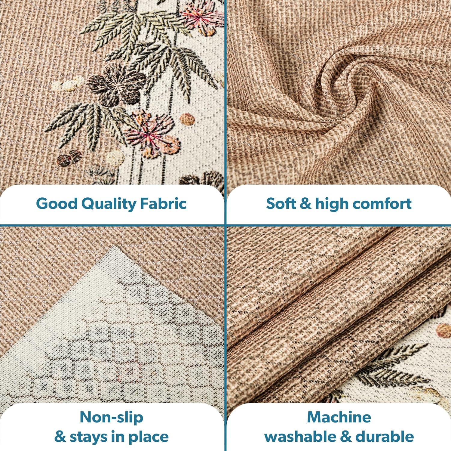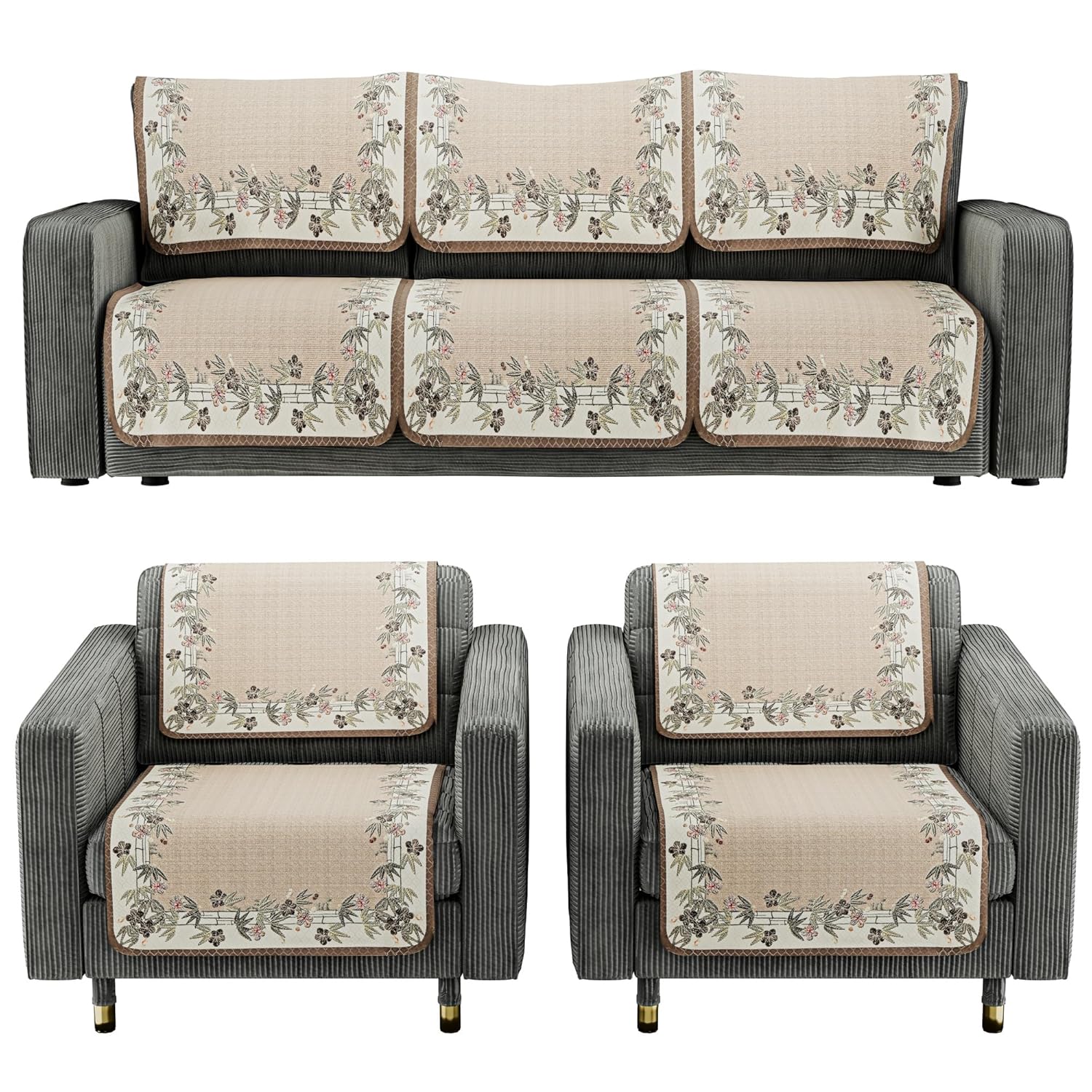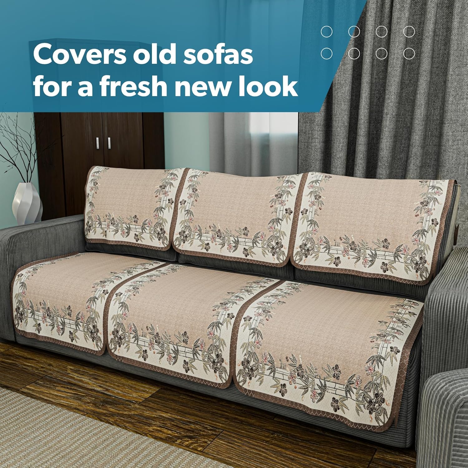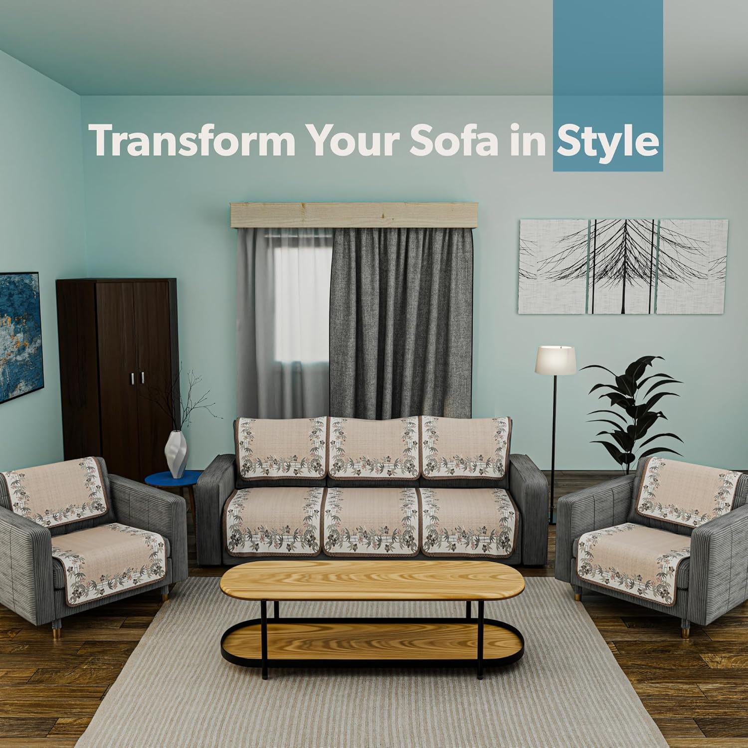 ✅ 𝗣𝗔𝗖𝗞𝗔𝗚𝗘 𝗖𝗢𝗡𝗧𝗔𝗜𝗡𝗦 – (10 Pcs) 5 Seater Sofa Cover | Color – Paradise 1139 – Cream & Brown | Material – Net Cotton | Product Dimensions – 3 Seater : 176 cm x 77 cm x 1 cm | Single Seater : 58 cm x 77 cm x 1 cm