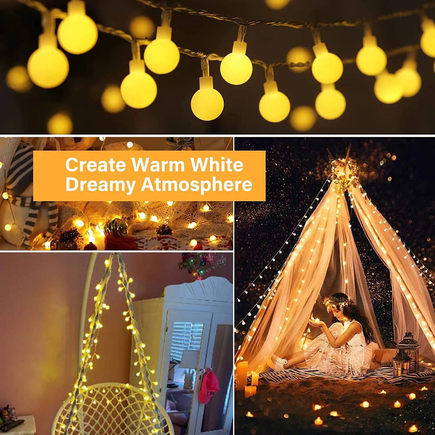 ABOUT THE PRODUCT: This light decoration set includes a 14-feet string of ball lights, this is a cord light. Featuring 14 LED light for decoration with warm white glow, this fairy lights for room decoration set creates a cozy and inviting atmosphere. Ideal for indoor and outdoor use, the stylish ball-shaped covers provide modern classic lighting. This snow ball lights for home decoration are perfect wall lights for home decoration, serial lights for decoration outdoor, room decor lights for bedroom, balcony lights for decoration, christmas decorations items for home, christmas tree decoration items, also as fairy lights for room decoration, christmas decorations lights, christmas tree lights