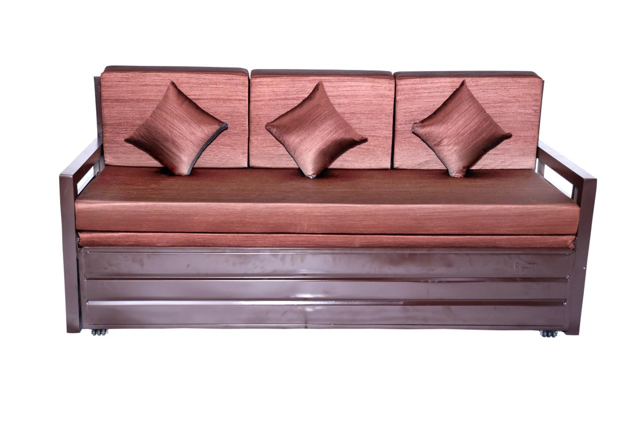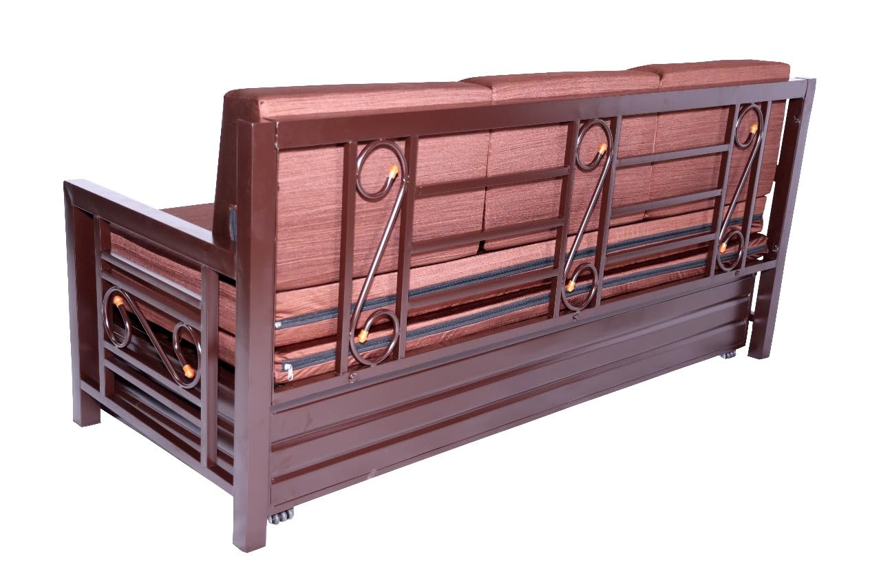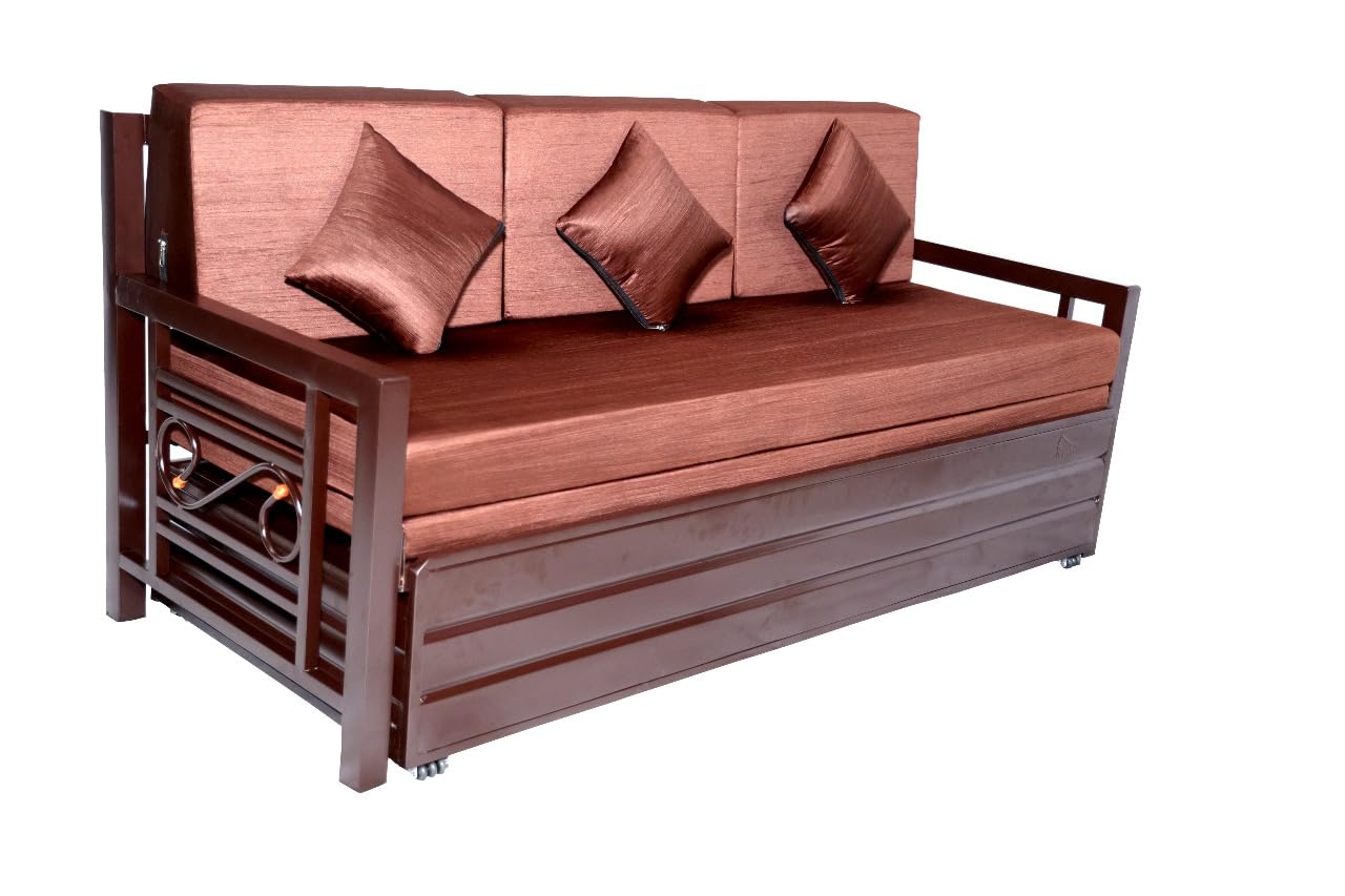 (as of The ROYAL BED MANUFACTURER Metal Sofa Cum Bed is a stylish, space-saving furniture piece designed for modern homes. Built with a sturdy matte brown powder-coated steel frame, it combines strength, durability, and elegance. The soft brown cushions and matching pillows offer superior comfort, while the smooth pull-out mechanism allows effortless conversion from a 3-seater sofa to a full-size bed. Ideal for living rooms, guest rooms, and compact apartments, this sofa cum bed blends premium design with everyday functionality—making it a perfect choice for those who value both comfort and versatility in their home décor