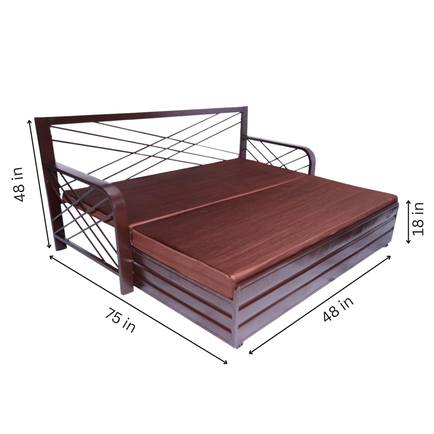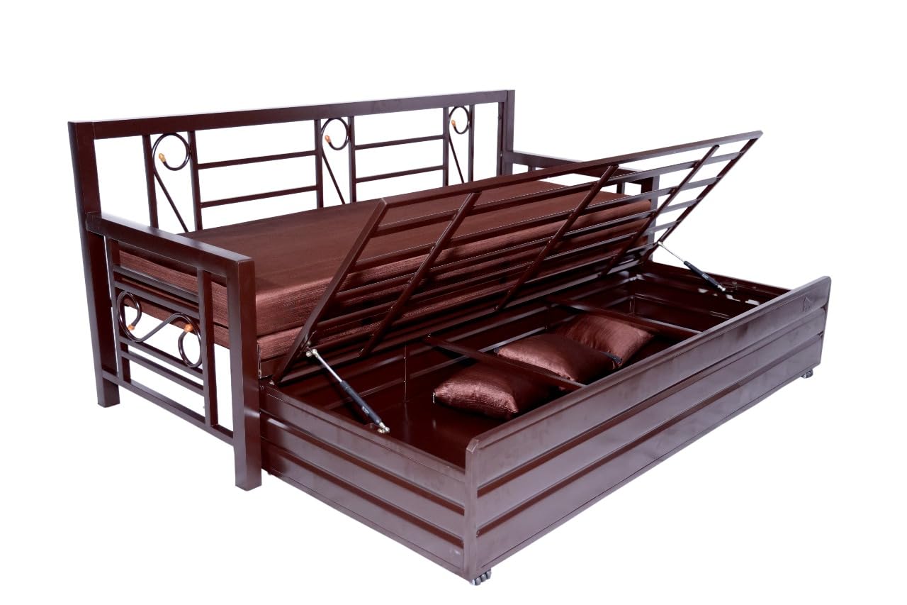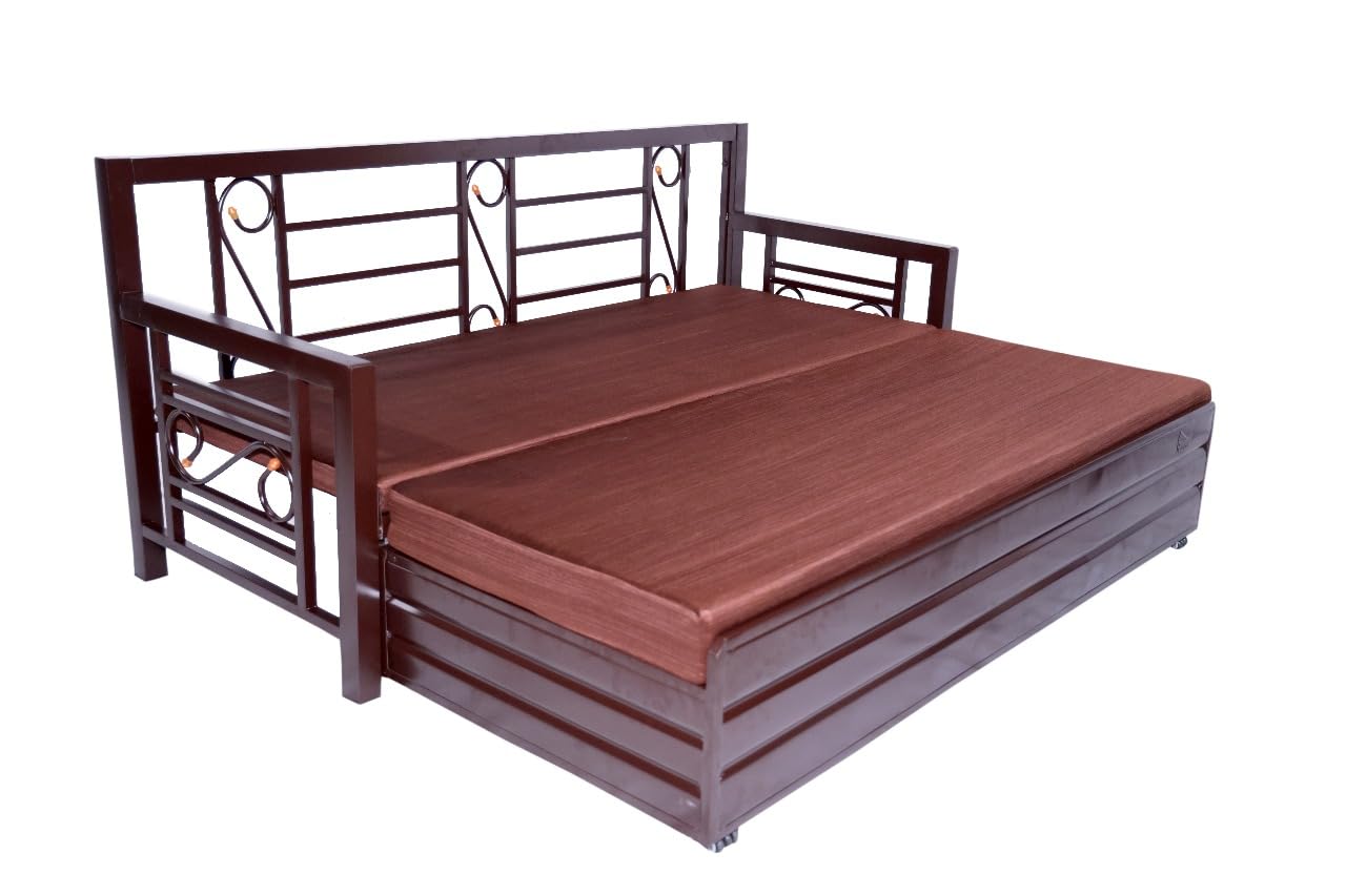 (as of The ROYAL BED MANUFACTURER Metal Sofa Cum Bed is a stylish, space-saving furniture piece designed for modern homes. Built with a sturdy matte brown powder-coated steel frame, it combines strength, durability, and elegance. The soft brown cushions and matching pillows offer superior comfort, while the smooth pull-out mechanism allows effortless conversion from a 3-seater sofa to a full-size bed. Ideal for living rooms, guest rooms, and compact apartments, this sofa cum bed blends premium design with everyday functionality—making it a perfect choice for those who value both comfort and versatility in their home décor
