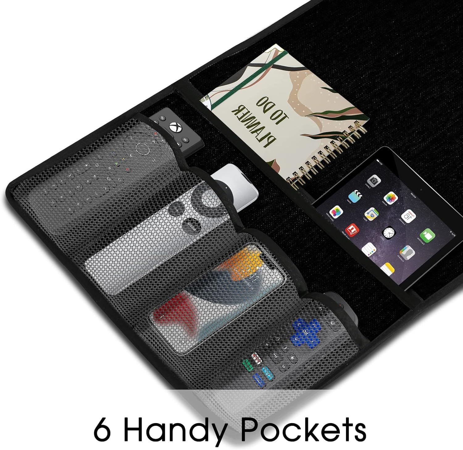 【Handy Pockets】: 5 pockets of the sofa armrest organizer are designed for your necessities. You can put newspaper, magazines, iPad and tablet into the two largest pockets, remote controls, eye-glasses, mobile phones and other portable devices into the four standard pockets, keep them handy whenever you need them.