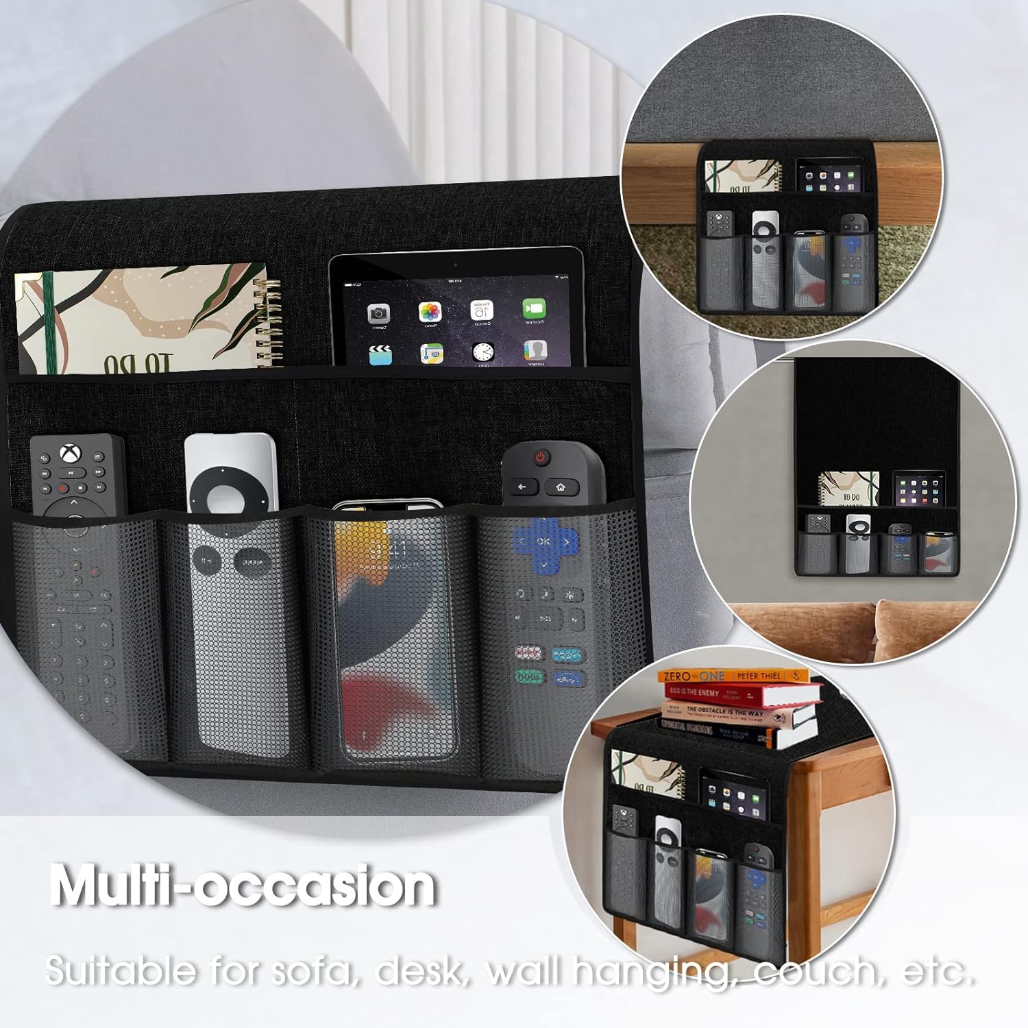 【Easy to Install】: Put the end of couch caddy under the sofa cushion, and then pass the other end around the sofa armrest so that the hand can just get the contents of the pocket, the sofa armrest organizer will never slide off with the end pressed.