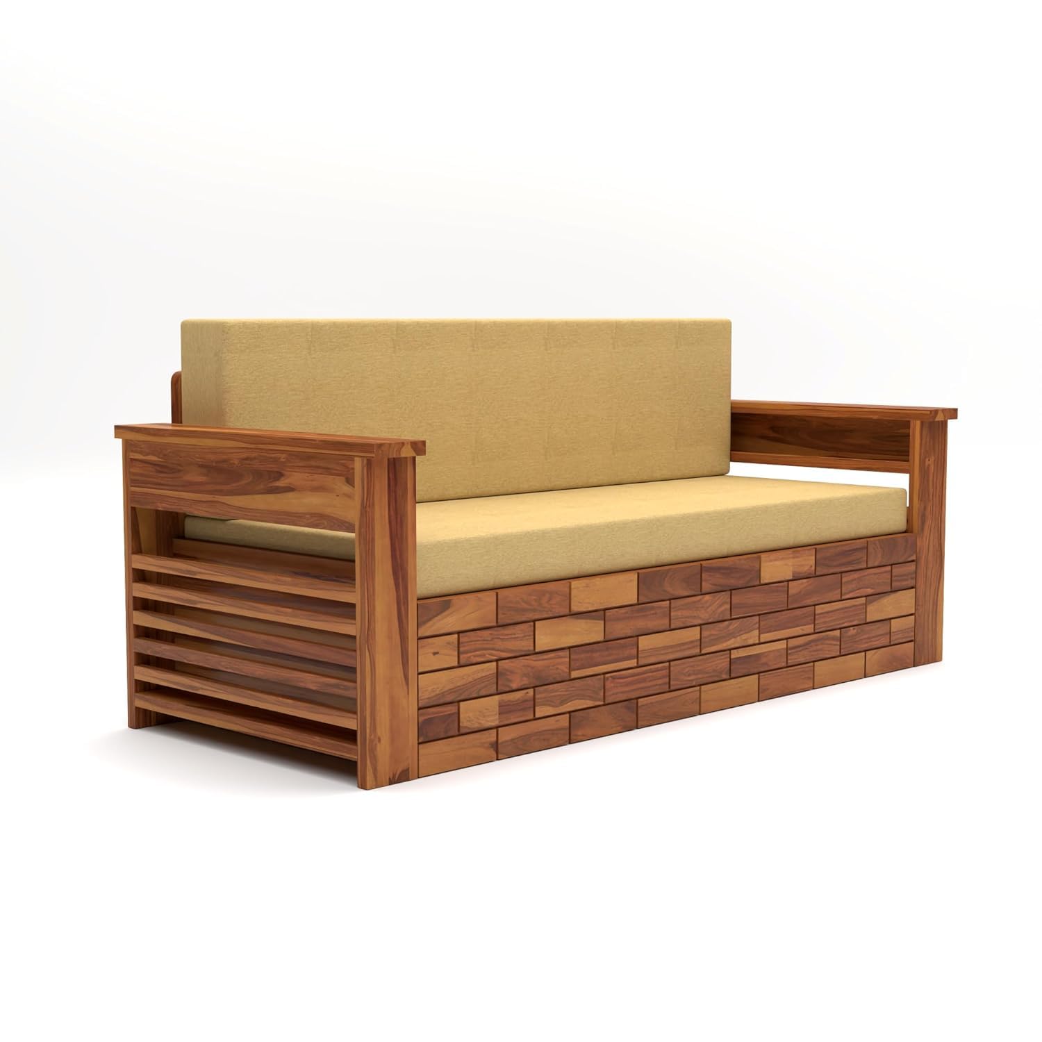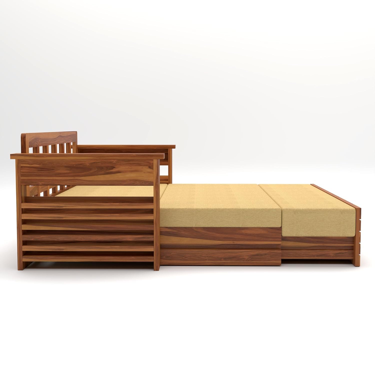 Material: Sheesham Wood, Color:Natural Finish Style: Contemporary, Seating Capacity: 3 Seater Sofa Cum Bed.