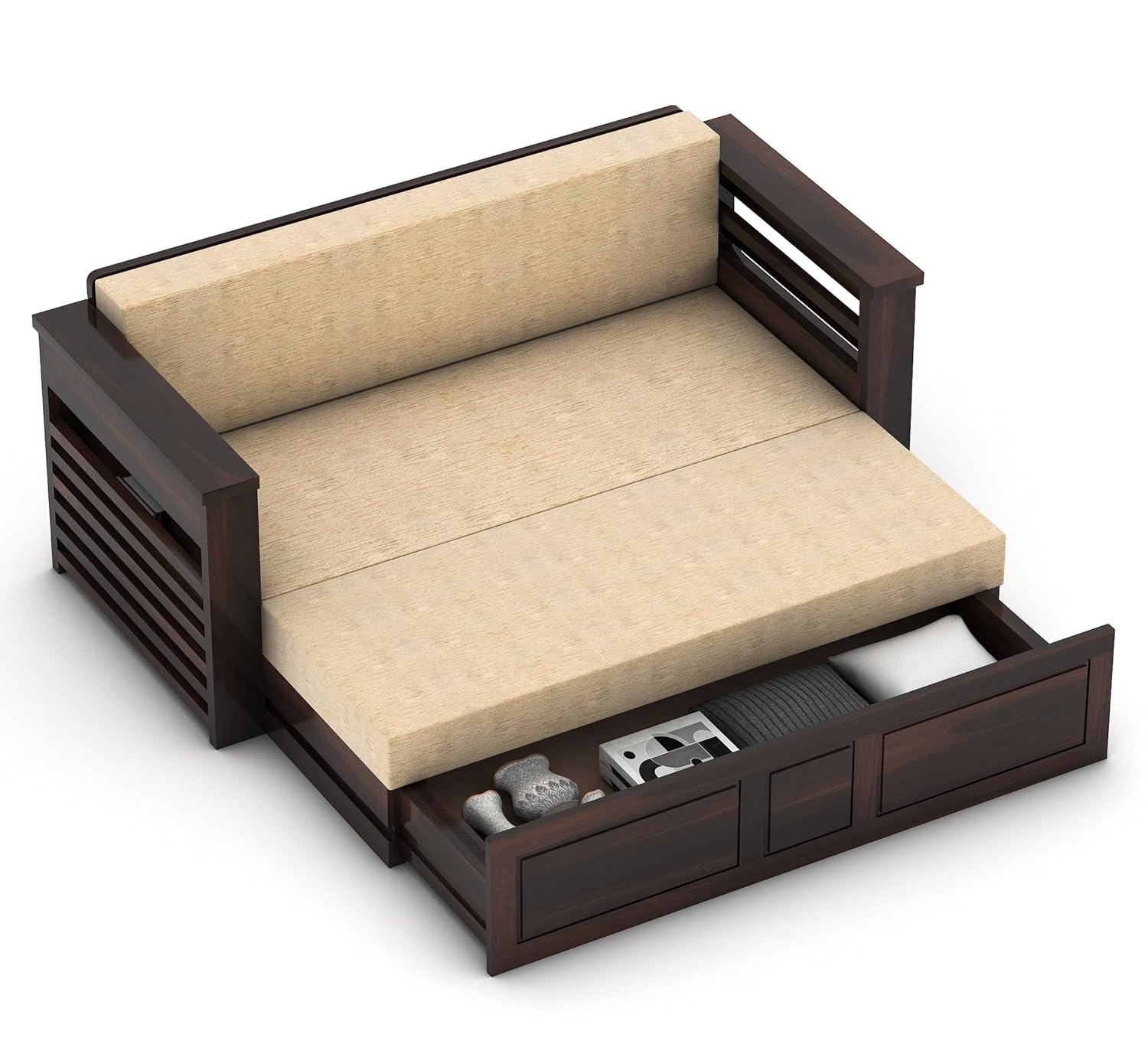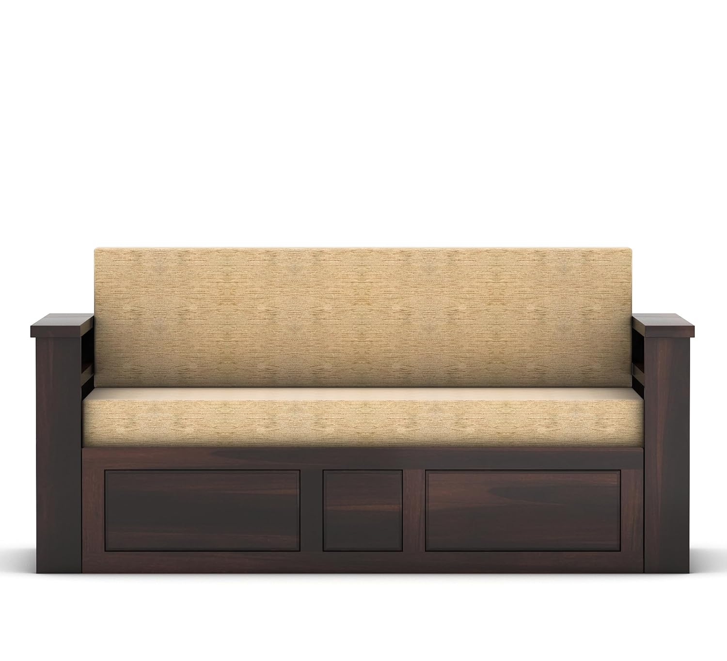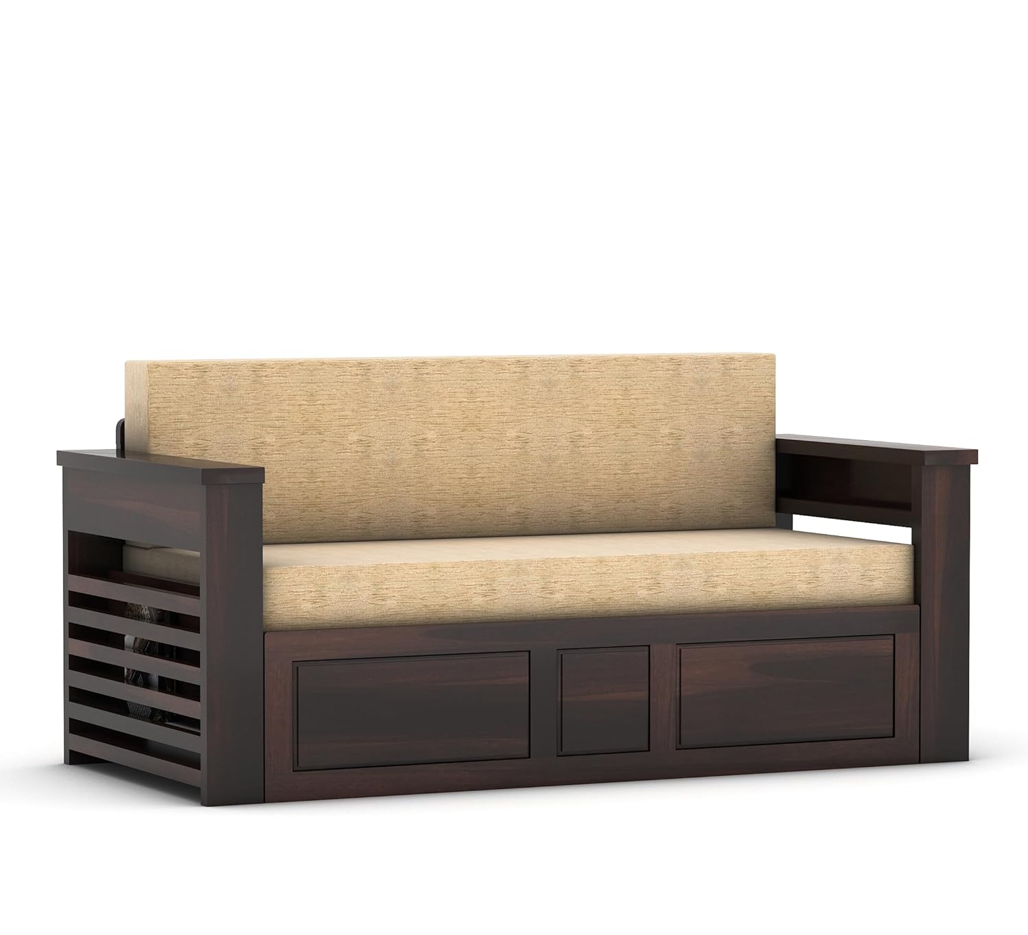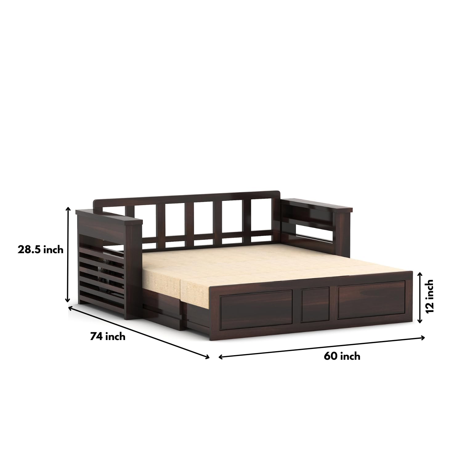 Product Dimensions(In Cms): Outer Size: Length 175 X Width 79 X Height 76 | Bed Inner Size:Length 152.4 X Width 183Solid Teak Wood Sofa Cums bed for Home living room Sofa Cums bed Wooden With Storage Sofa Cums bed 3 seater FurnitureFunctions as a comfortable 3-seater sofa and converts into a spacious bed for versatility.Features integrated storage compartments beneath the seating area for convenient organization.Ideal for maximizing space in living rooms or guest rooms while adding a touch of natural elegance to your home decor.