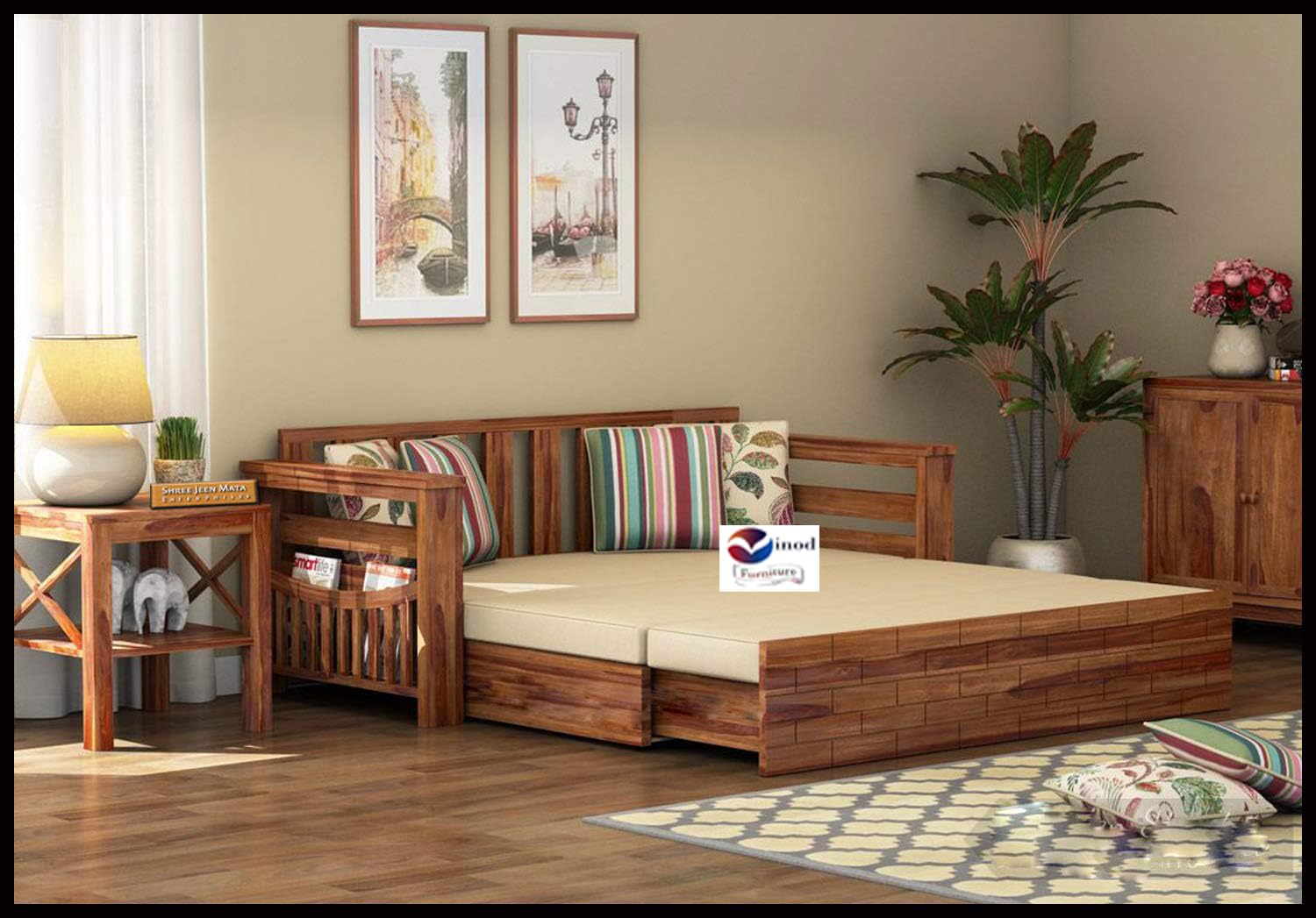 Vinod Furniture Solid Wooden Sheesham Teak Wood 3 Seater Sofa Cums Bed for Home Furniture | Wooden Bed Cums Sofa Furniture with Storage | Without Pillow with | Living Room | (Teak Finish);Dimensions: Sofa:- Length 60 Inch x Width 30.5 Inch x Height 30 Inch, Sofa Cum Bed:- Length 50 Inch x Width 72 Inch x Height 27 Inch