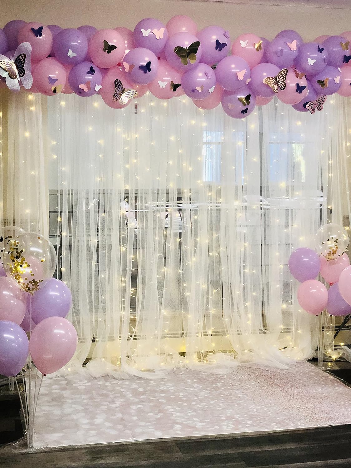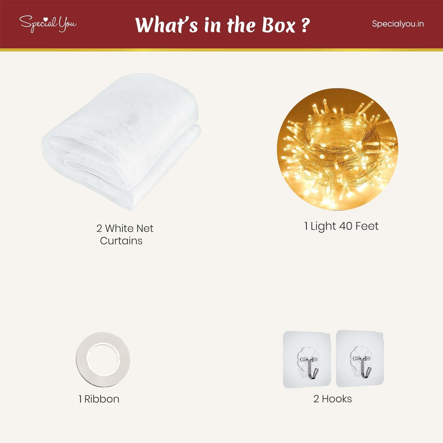 The kit includes 2 white net curtains, 1 fairy led light 40ft long, 2 hooks, 1 ribbon perfect for traditional backdrop decoration, bedroom, living room wall decor items.