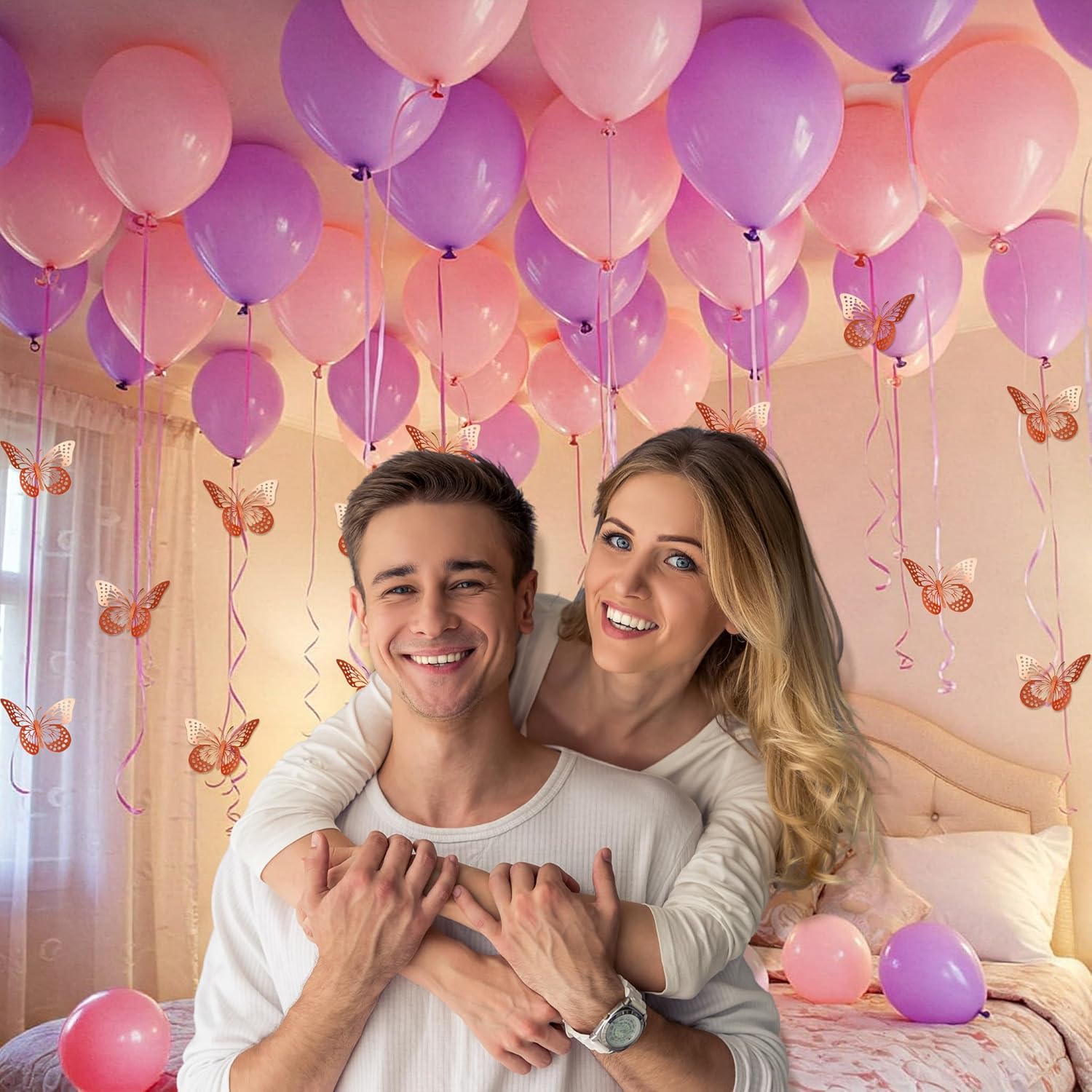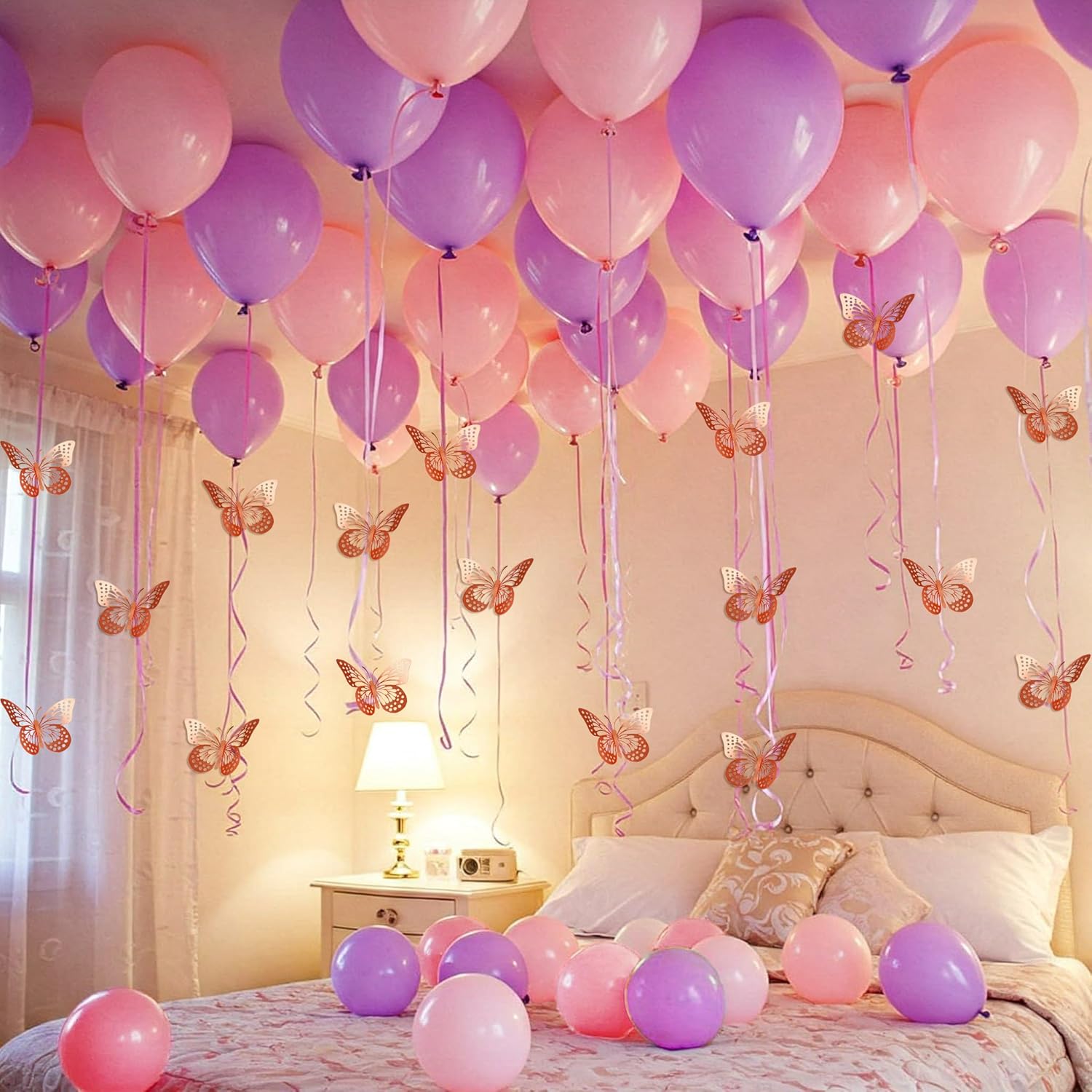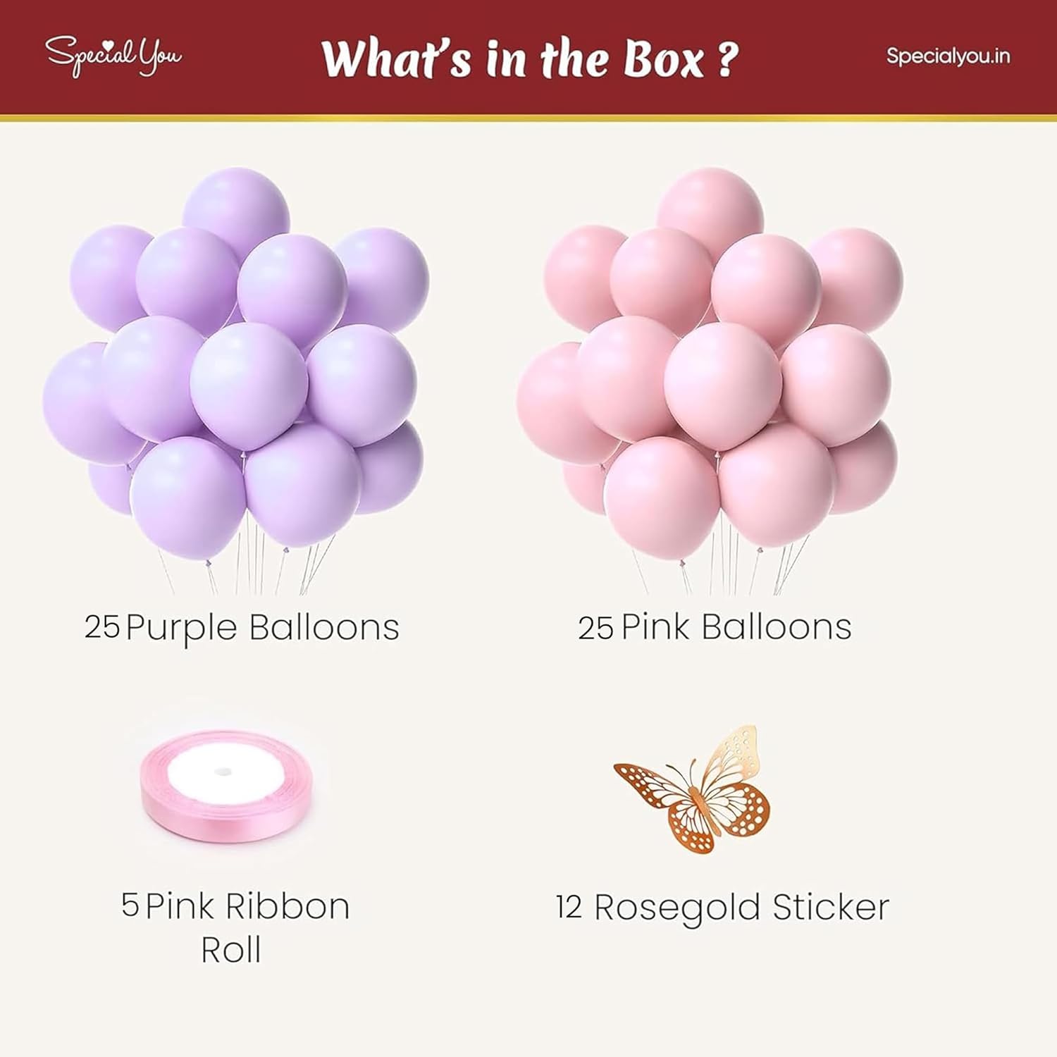 The kit includes 25 Pastel Purple,25 Pink Balloons with 12 Rosegold 3D Butterflies, 10 Pink Ribbons.