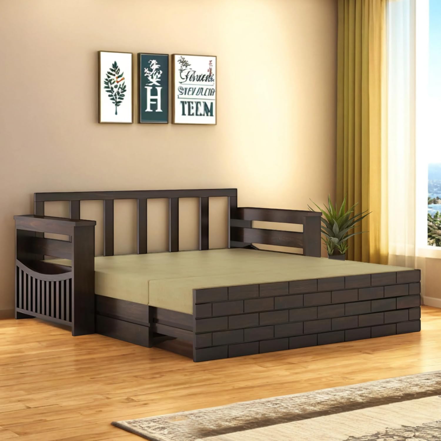 Solid Sheesham Wood Construction: Crafted from good-grade Sheesham wood, this sofa cum bed ensures long-lasting durability and sturdiness. The walnut finish highlights the natural wood grain, lending a warm and inviting aesthetic to your home decor.