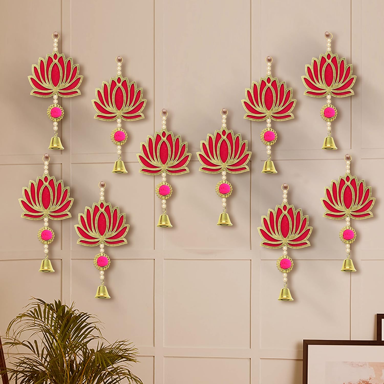 TIED RIBBONS Pack of 10 Wall Door Hanging Lotus Latkan Toran with Bells (22.8 cm x 9.6 cm) – Main Door Entrance Pooja Room Temple Wedding Festival – Decoration Items for Home Décor