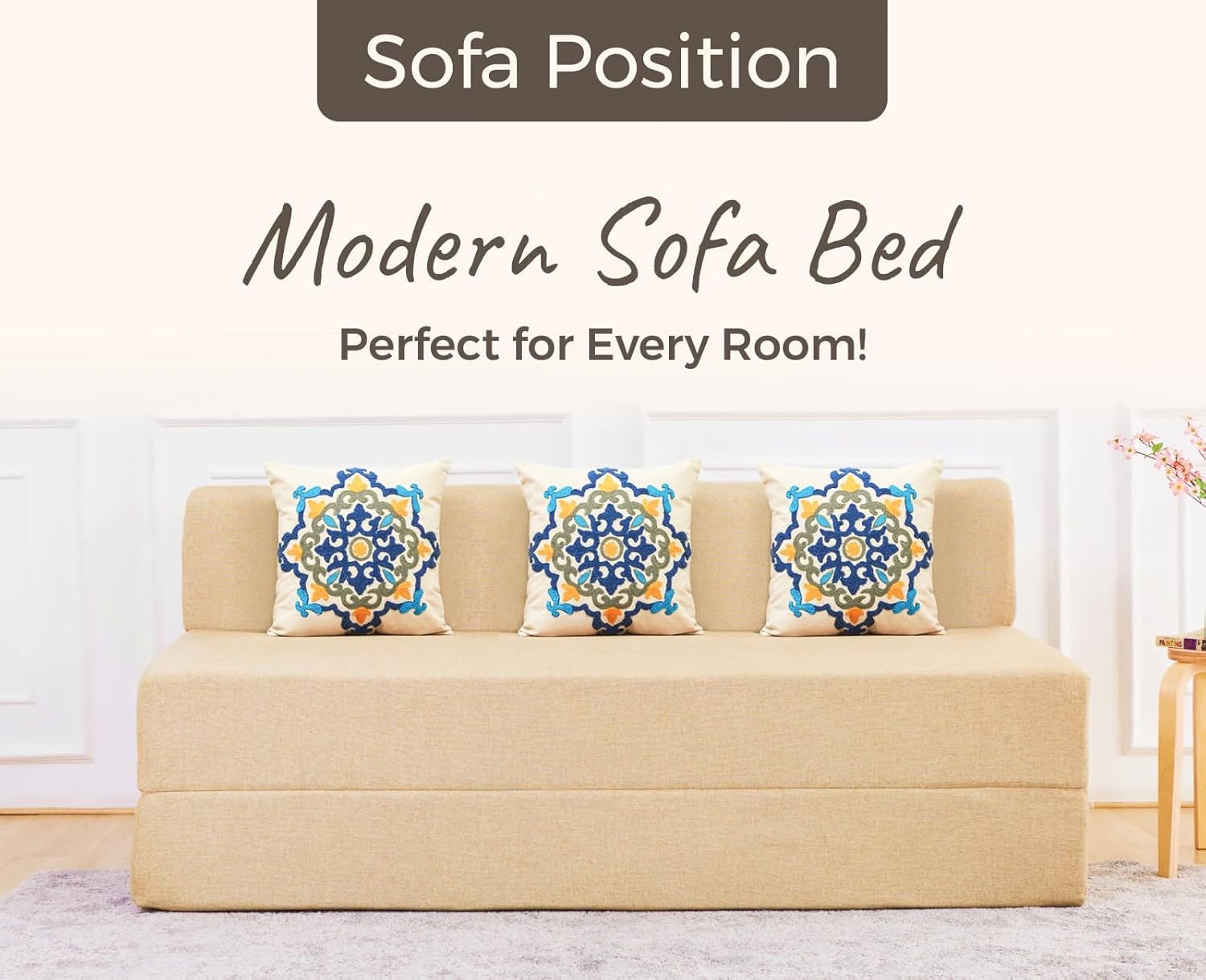 Complete Package: Your purchase includes 1 Uberlyfe Beige Sofa cum Bed, accompanied by 3 cushions and 3 fillers, all adorned with a stylish Blue Medallion pattern, adding a touch of elegance to your living space. , , uberlyfe , Details)