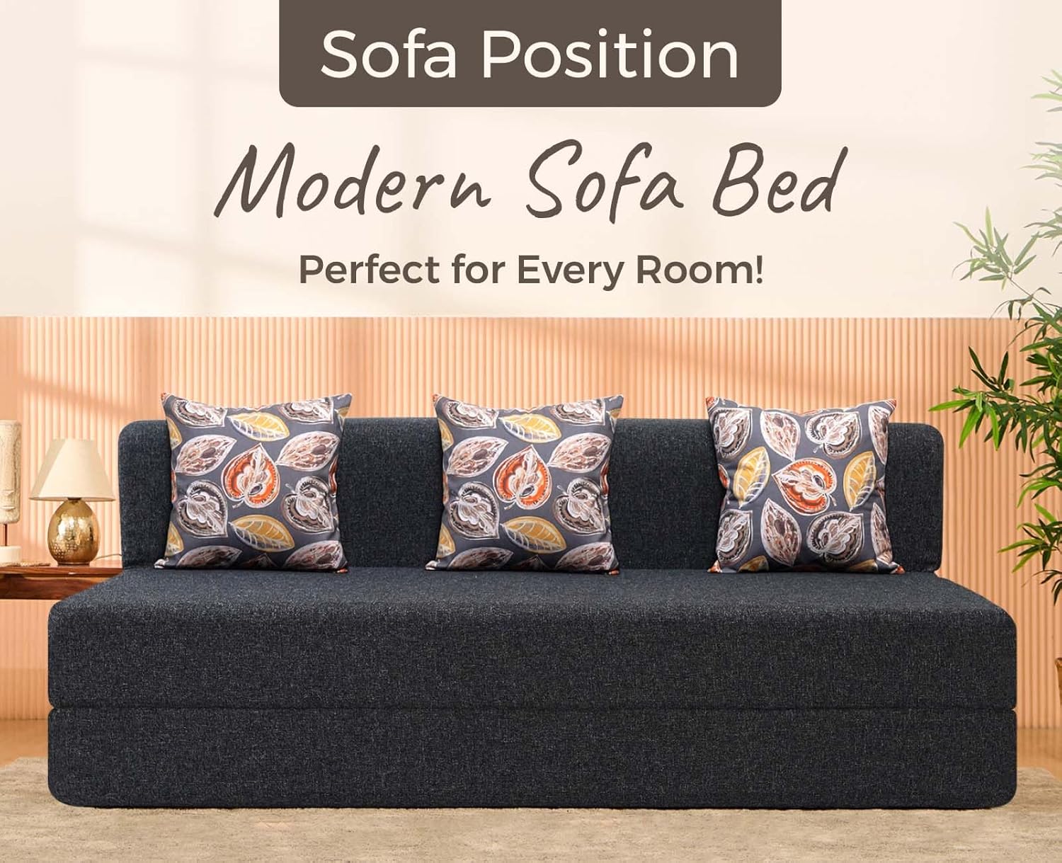 Complete Package: The package includes 1 Uberlyfe Dark Grey Sofa cum Bed featuring a stylish Fallen Leaves Pattern, along with 3 pillow covers and 3 fillers, providing everything you need to enhance your living space. , , uberlyfe ,