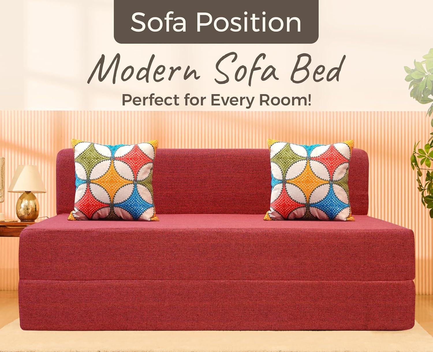 Complete Package: The Uberlyfe Primrose Red Sofa cum Bed comes complete with 2 pillow covers, 2 fillers, and features a stylish Jharokha pattern, adding a touch of elegance to any home decor. , , uberlyfe , Details)