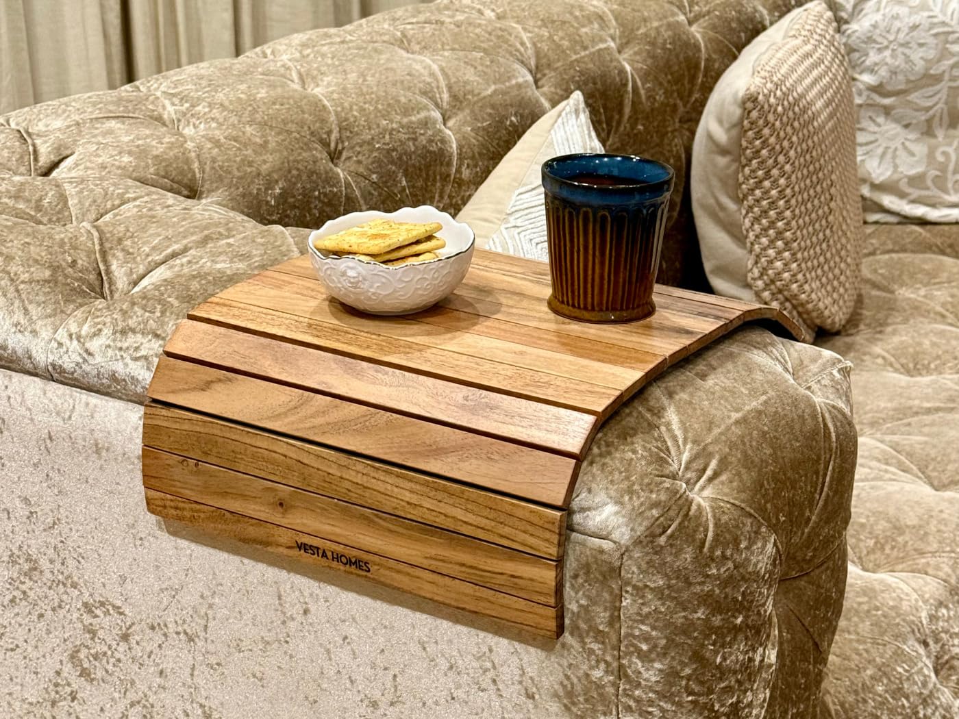 SERVE FOOD DRINK ON YOUR SOFA/BED/RECLINERS: Wraps around your sofa/recliner armrest, and you can serve food / drink / wine / whiskey with ease. Can also be used to serve food on bed / table.