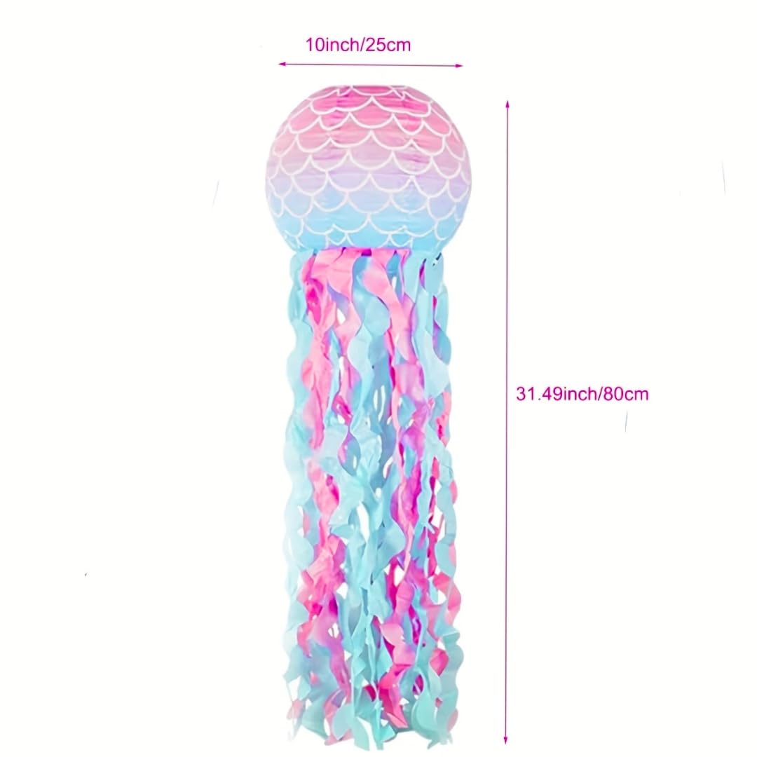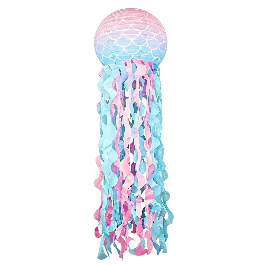 Unique Mermaid-Themed Hanging Lantern: Bring magical under-the-sea vibes to your celebration with this beautifully crafted Mermaid Jellyfish Lantern. With soft pink and blue hues, this hanging décor piece creates an enchanting focal point, perfect for mermaid or ocean-themed parties. Its flowing tentacle-like paper streamers give it the look of a real jellyfish, adding motion and charm to any space.