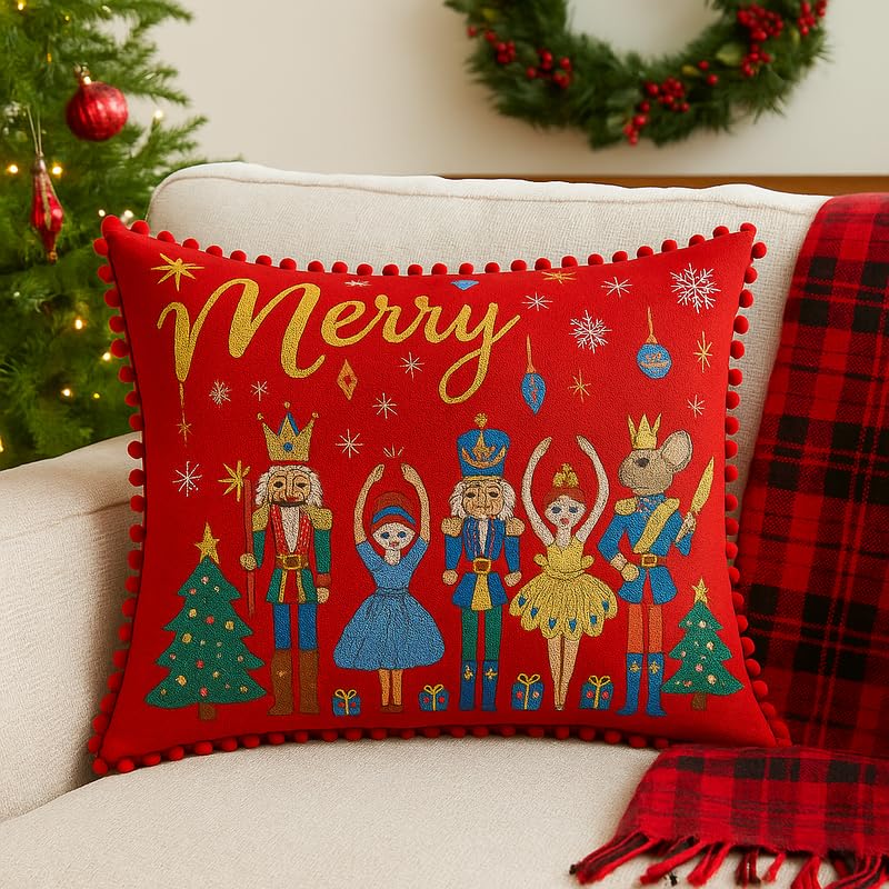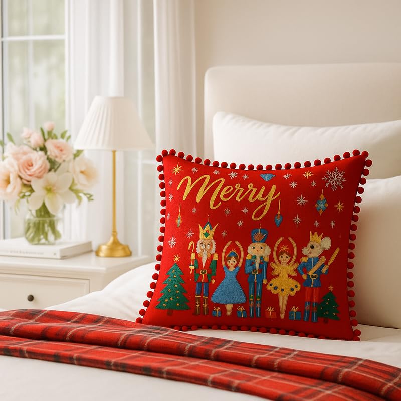 (as of Elevate your festive décor with this exquisite Nutcracker Christmas Cushion, a true masterpiece that captures the magic of the holiday season. This cushion is a statement piece, blending Traditional Decor with High Glam Cushion style, perfectly designed to transform your home into a whimsical holiday haven. Majestic Design & Opulent Palette: The cover features a rich Wine Red background, beautifully adorned with a detailed embroidery or high-fidelity Digital Print Cushion of the beloved Nutcracker Character Cushion ballet scene. Prominently displayed is the word “Merry” in glittering Gold Leaf Detail Cushion script, surrounded by festive snowflakes and stars. The scene includes the brave Nutcracker, the Mouse King, and elegant dancers, flanked by festive Christmas Trees and gift boxes. This opulent design is framed by a generous trim of soft, tactile Pom-Pom Cushion embellishments in matching Wine Red. This Red Gold Cushion effortlessly embodies the spirit of a Classic European Cushion and Victorian Cushion elegance. Premium Quality & Festive Appeal: Crafted from a durable and soft Polyester Cushion base, this Festive Throw Pillow provides a luxurious, slightly Embroidered Cushion look and a comforting Smooth Cushion feel. The pom-poms are secured with Hand-Stitched Cushion precision, setting it apart from mass-produced items. This cushion cover is highly valued as an Interior Designer Choice for sophisticated Christmas Home Decor. Its shape and ornate Character Cushion Pattern make it a versatile Living Room Accent Cushion and the ideal Holiday Decor Pillow.