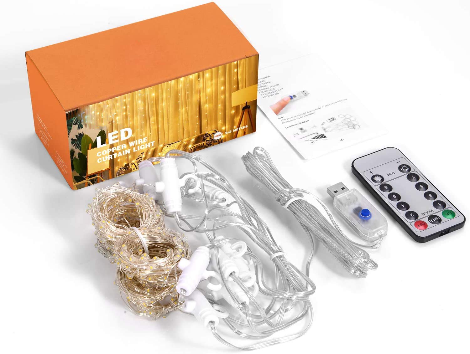 8 Modes Curtain String Light – 9.8ft*9.8ft(width*length), 300 WARM WHITE LED curtain lights. Gorgeous lighting modes including:Combination, Wave Flash, Alternating Flash, Breath, Chase, Slow Flash, Flash and Constant Light; Just one button to get your favorite light mode.